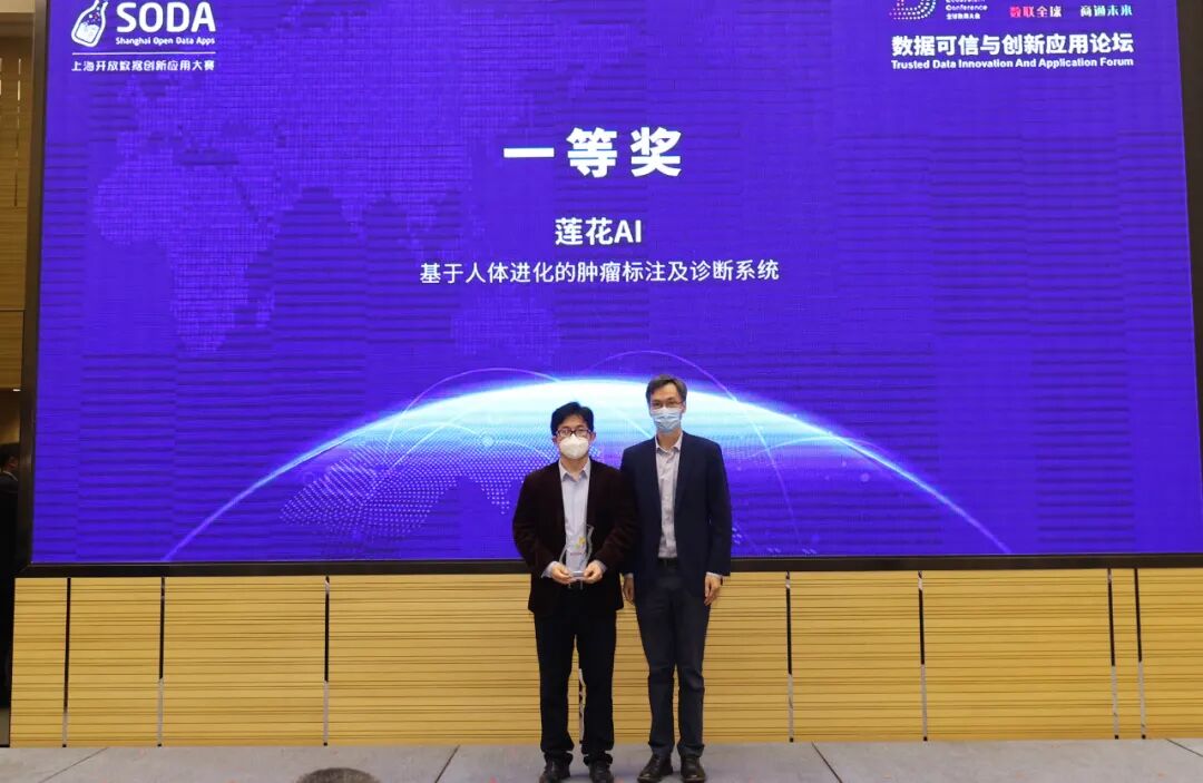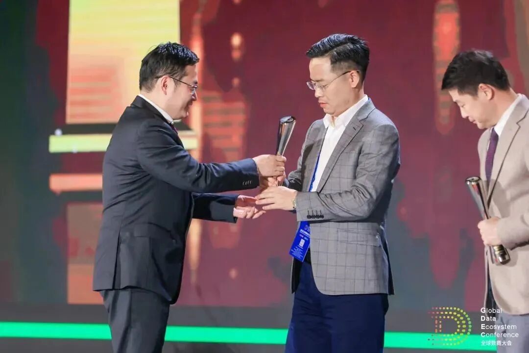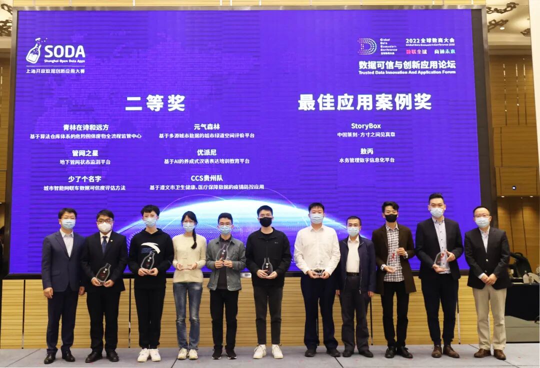 上海市大数据股份有限公司总裁刘九评,德晋贵宾厅高新集团党委副书记、总裁陈军,静安区科委副主任吴启南为二等奖、最佳应用案例获奖团队颁奖