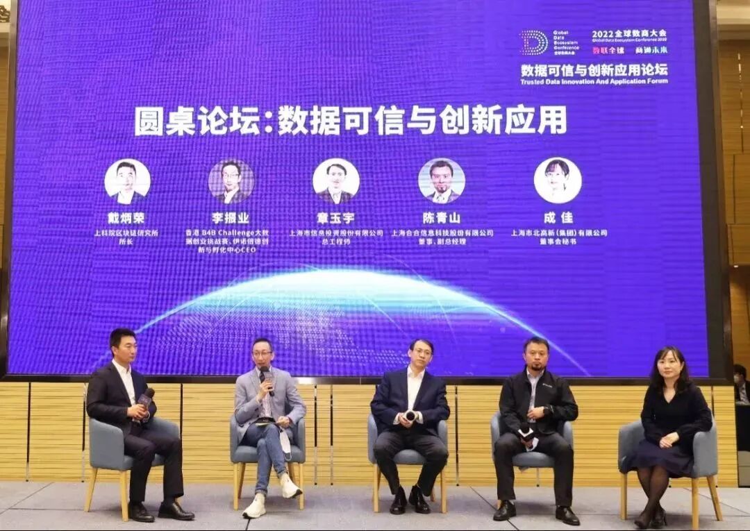 本次论坛的圆桌讨论环节,邀请嘉宾包括:上科院区块链研究所所长戴炳荣博士,香港B4B Challenge大数据创业挑战赛、伊诺倍德创新与孵化中心CEO李振业,上海市信息投资股份有限公司总工程师章玉宇,合合信息科技股份有限公司董事、副总经理陈青山,德晋贵宾厅高新(集团)有限公司董事会秘书成佳,五位嘉宾共同围绕数据可信的核心内涵、价值动因、应用场景等议题展开了讨论交流。